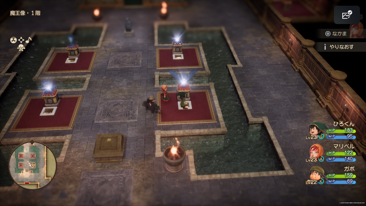 | [11] | 魔王像・1階 では、さばくのお守り を石碑にはめた後、左下⇒右上⇒右下⇒左上、の順に床を踏むと、先へ進める扉が開く。 |