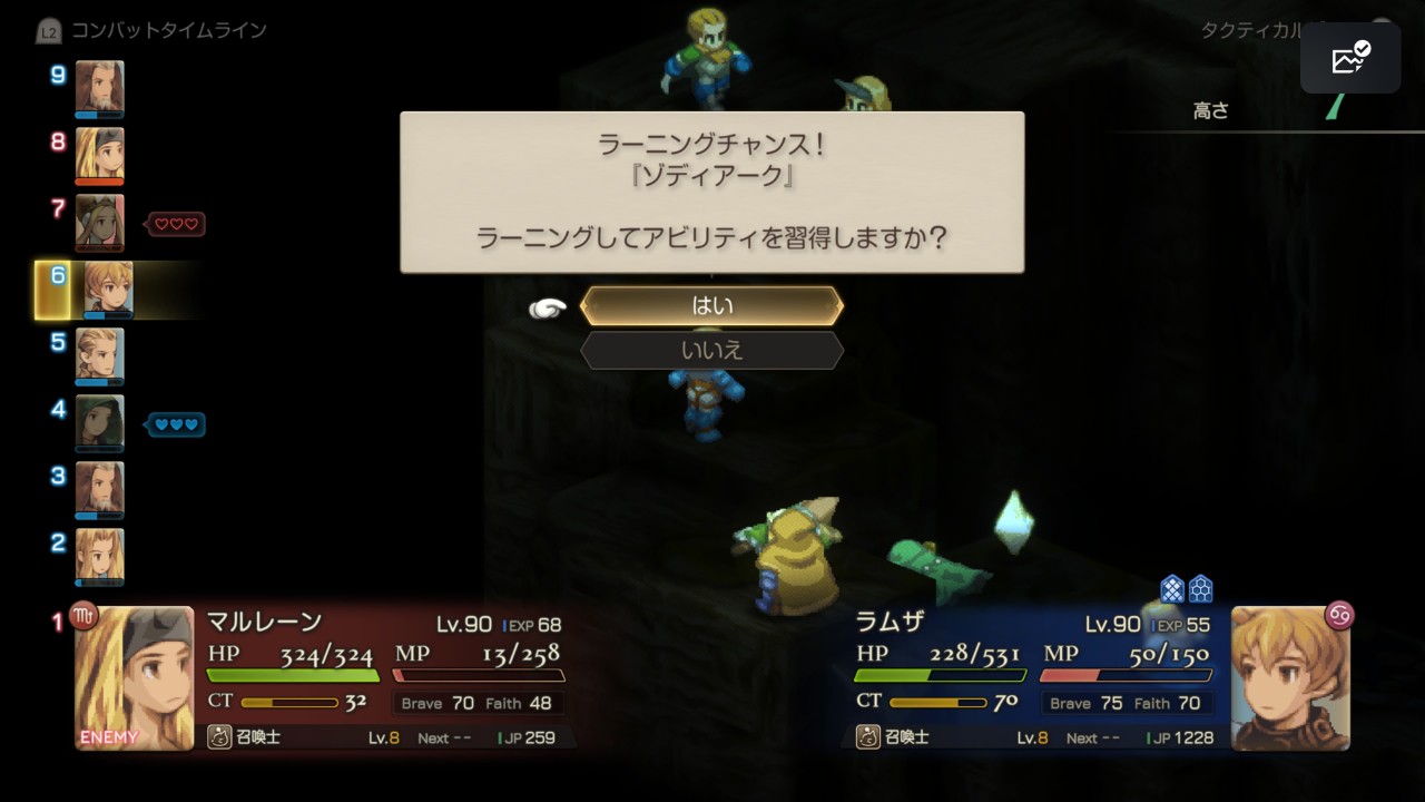 ■ 召喚魔法『ゾディアーク』は敵からのラーニングでのみ習得可能。 ■ ラーニングするには、敵が使用してきた ゾディアーク を 召喚士 で受けて、且つ 生きている必要がある。 ■ ラーニングは必ず発生するわけではない。 ■ ゾディアーク は『ディープダンジョン : END』で出現する『悪魔王サーペンタリウス』が使用してくる。 ■ ゾディアーク をラーニングできずに 悪魔王サーペンタリウス を倒したとしてもラーニング可能。ディープダンジョン : END の再挑戦で、ランダムで出現する召喚士が ゾディアーク を使ってくる。 |