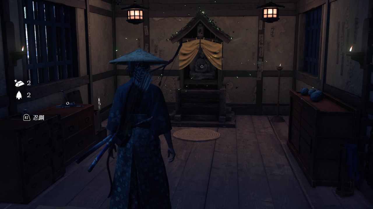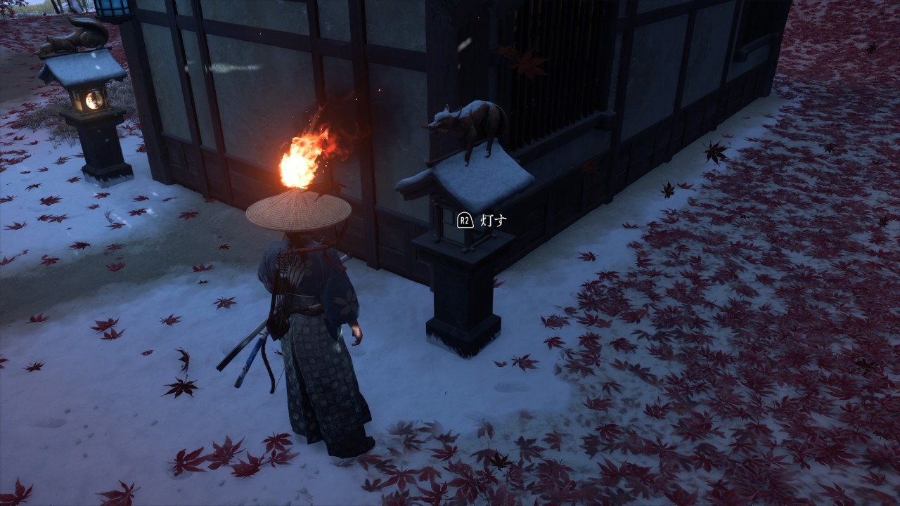 戸なしの小屋のまわりにある燈篭全てに火を灯すと、中へ入れる