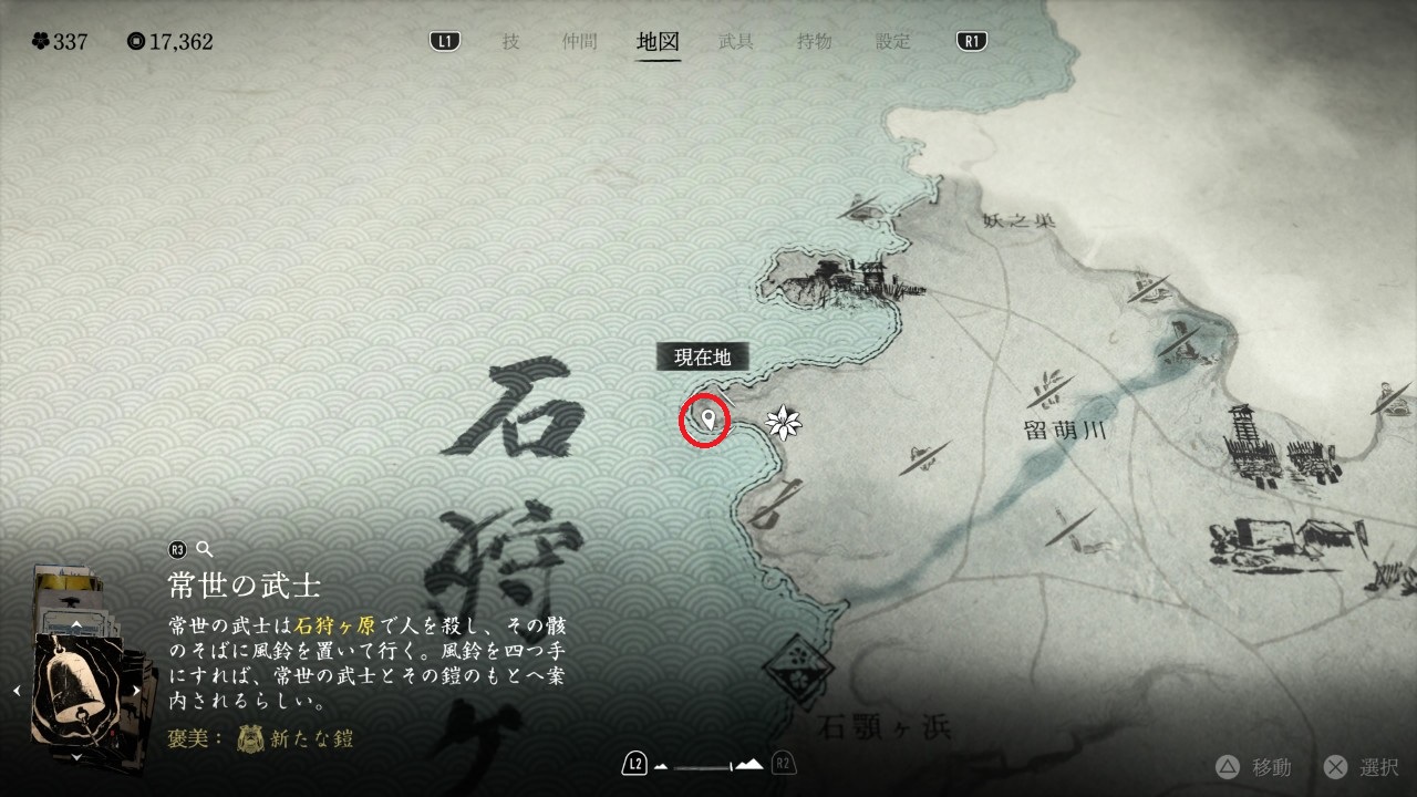 | [05] | 4つの 風鈴 を集めたら、以下の場所から 常世の武士 の場所へ行く。 |